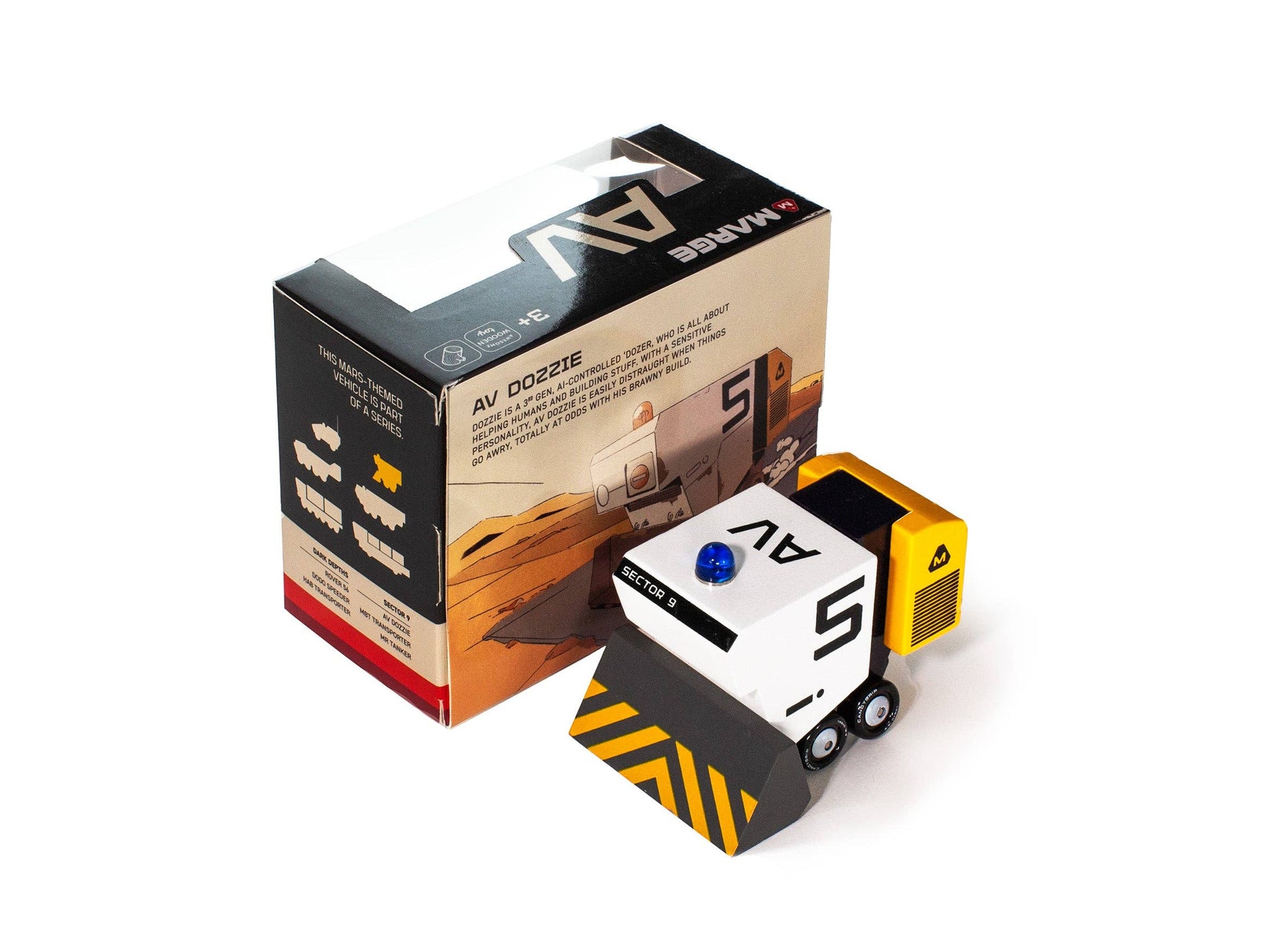 The bulldozer of the Sector 9 crew of vehicles! Dozzie has a magnetically detachable bulldozer blade and is ready to take on the biggest challenges.
